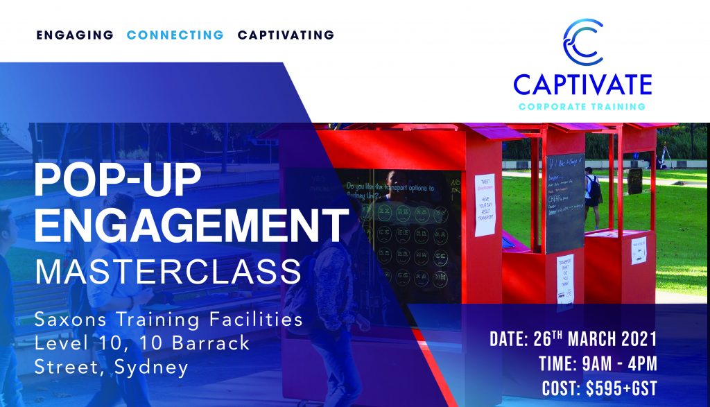 This one-day workshop is a practical, hands-on exploration of tools, techniques and strategies to design, develop and deploy pop-ups for community engagement. Using research and practical real-world examples, this workshop explores emerging digital trends, tools and technologies; as well as out of the box analogue methods, practices and approaches that can be applied to all types of community engagement.